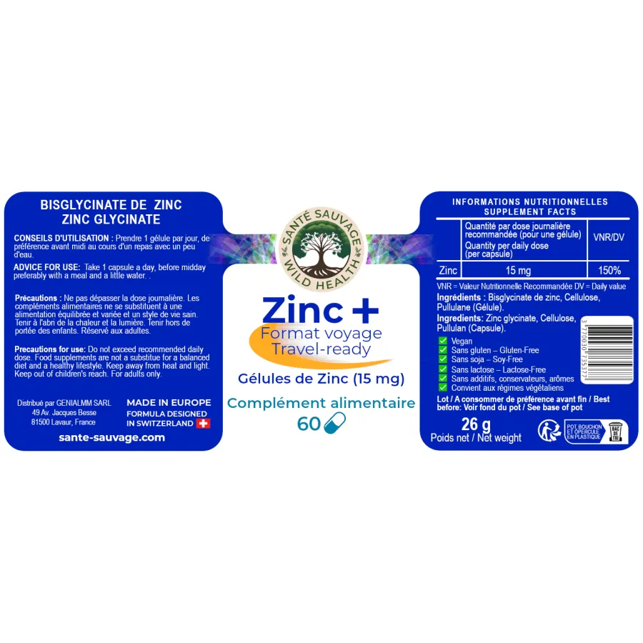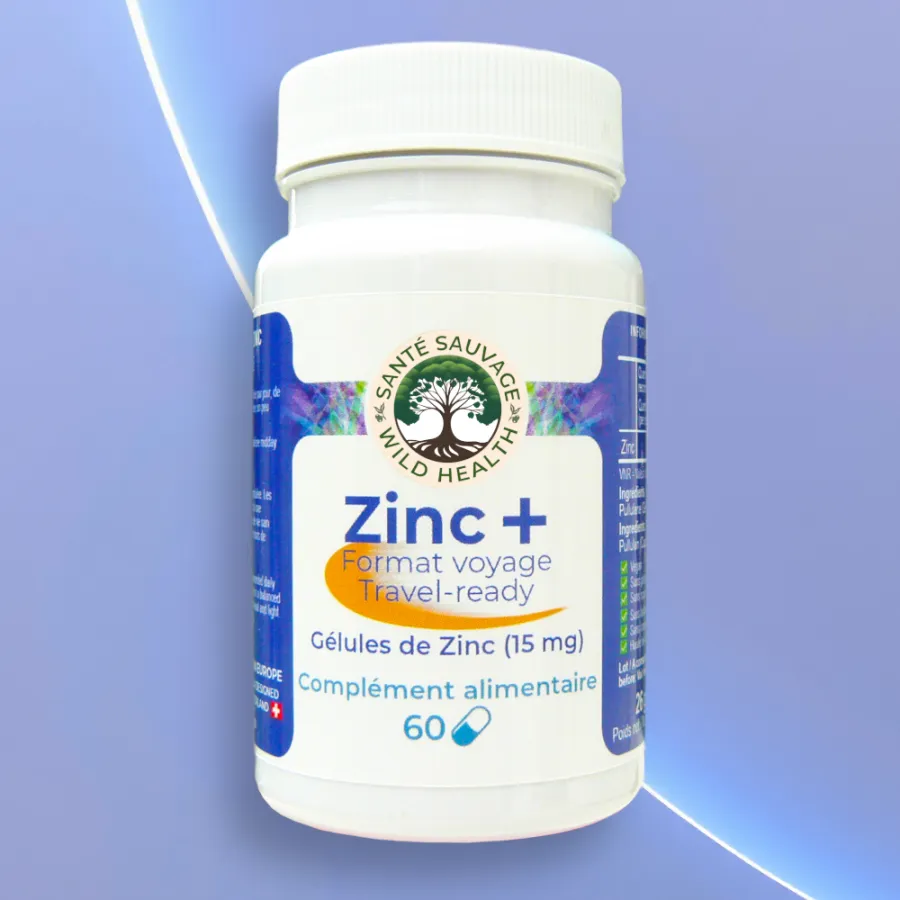 Ces deux formes ne se remplacent pas, elles se complètent pour vous offrir le choix selon votre mode de vie et vos préférences. Chez Santé Sauvage, nous savons que notre formule liquide de Zinc Sulfate offre une absorption rapide via les muqueuses buccales, idéale pour un soutien immunitaire immédiat. Pourtant, certains préfèrent la simplicité et la praticité des gélules, notamment en voyage, ou souhaitent une forme de zinc hautement pure et bien absorbée, mais qui passe par le système digestif. C’est pourquoi nous avons choisi le Zinc bisglycinate, reconnu pour son excellente absorption et sa douceur pour l’estomac. En proposant ces deux options, nous offrons plus de flexibilité :le zinc liquide pour une action rapide, et des gélules pures et pratiques pour un apport quotidien facile à emporter avec vous en voyage.